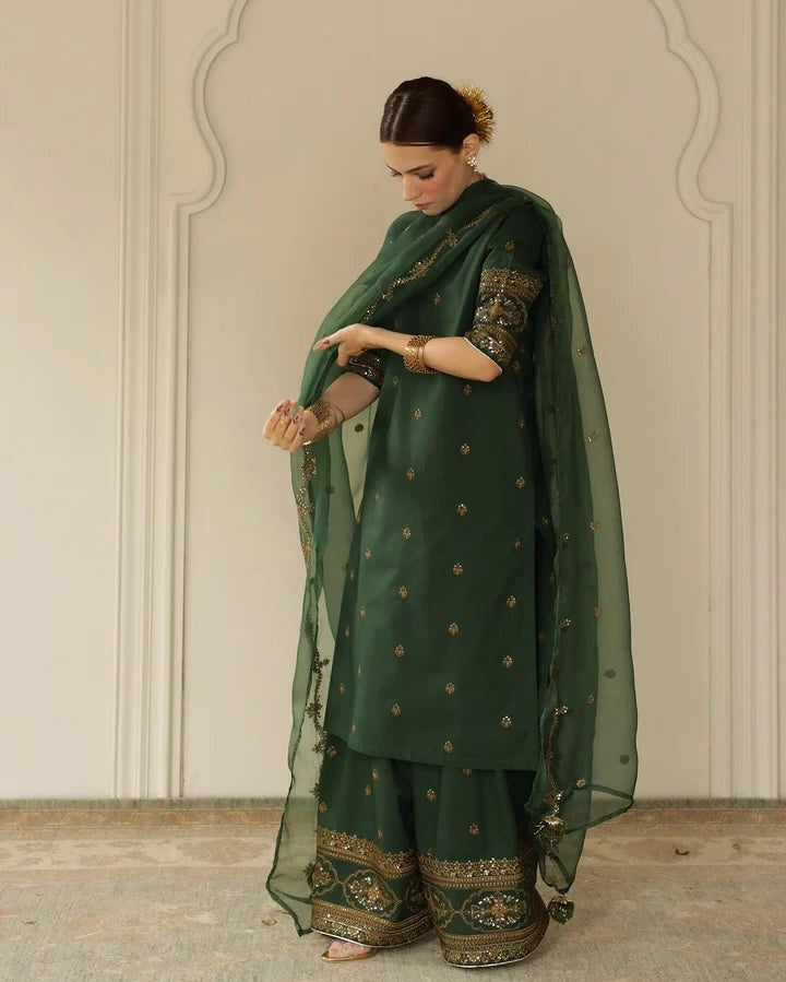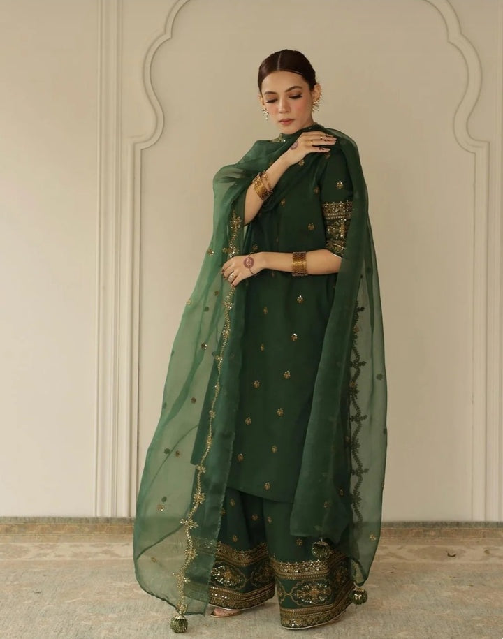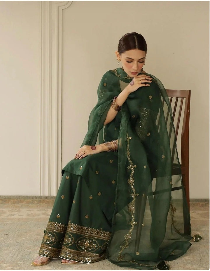 Paired with a pure organza embroidered dupatta, this outfit is designed to make a statement—whether for a casual day out or an evening gathering. Its timeless charm ensures a seamless transition from day to night.
