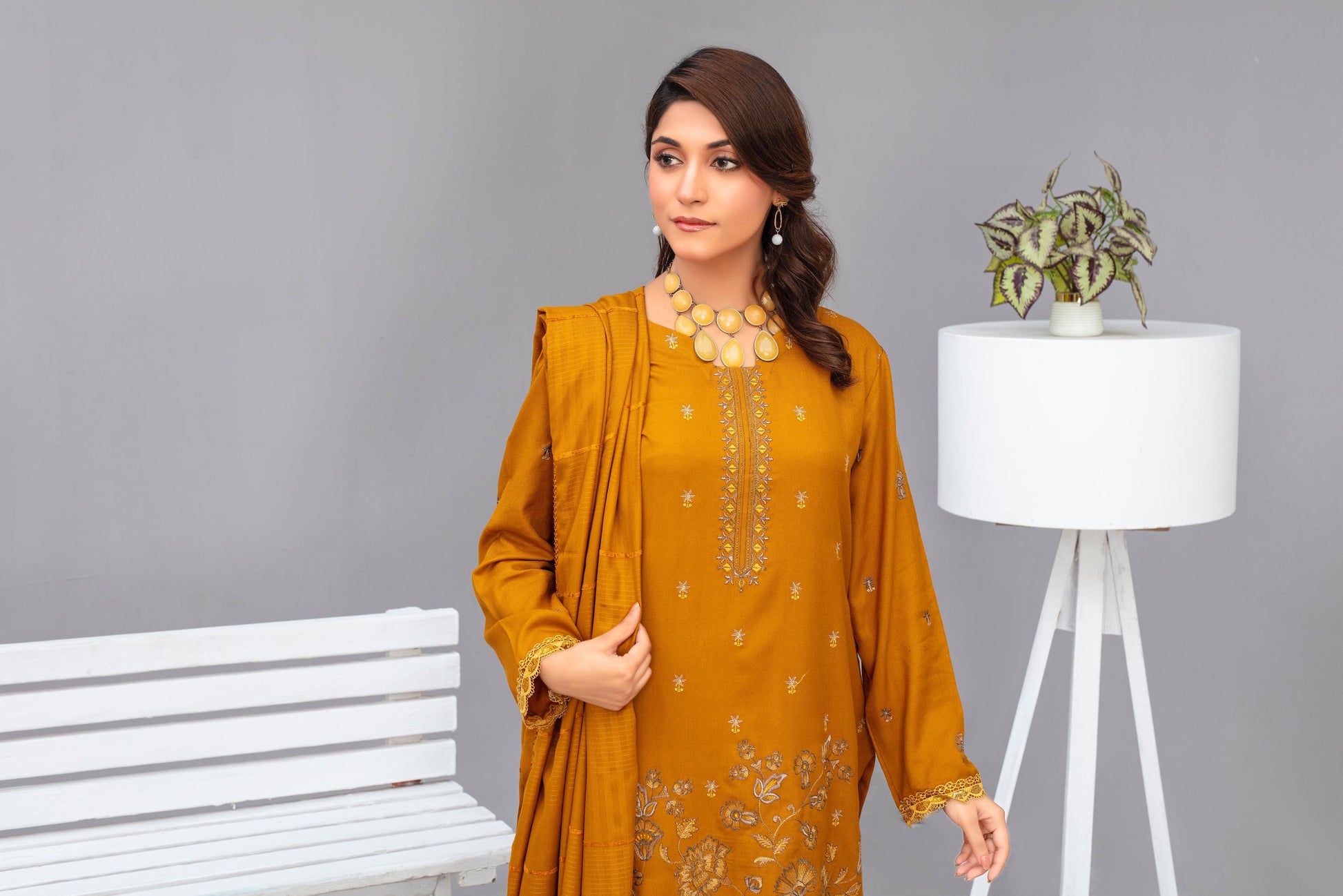 Brands inn-3PC Dhanak Embroidered Shirt with Velvet Dhanak Shawl and Trouser-Bic-2678- Y