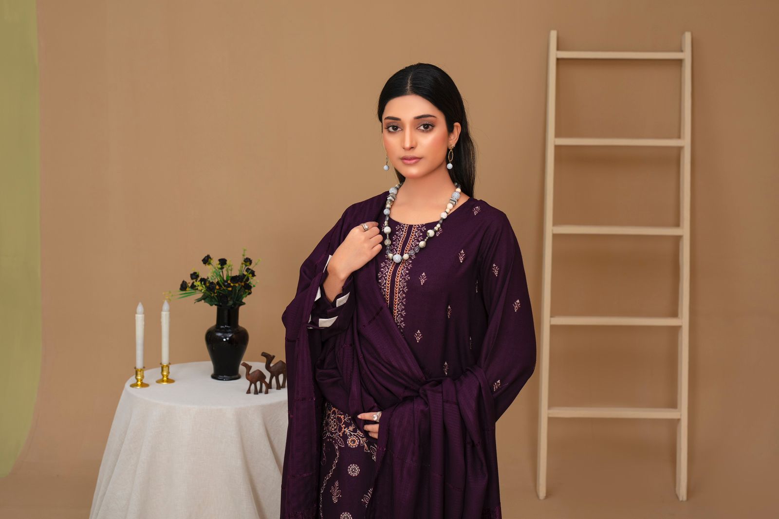 Brands inn-3PC Dhanak Embroidered Shirt with Velvet Dhanak Shawl and Trouser-BIC-PLUM