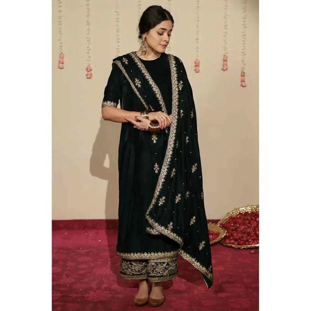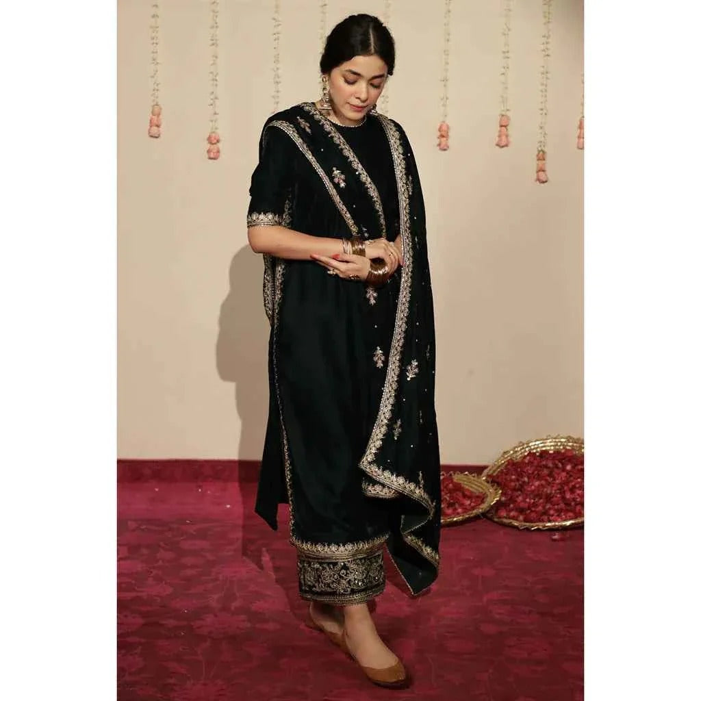 Step into luxury with this stitched bottle green velvet dress, designed to captivate. The stunning embroidery details exude sophistication, while the matching velvet shawl completes the ensemble with a graceful touch. Whether for a wedding or a festive evening, this dress is your go-to for elegant style.