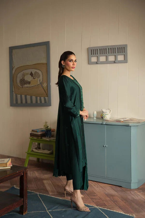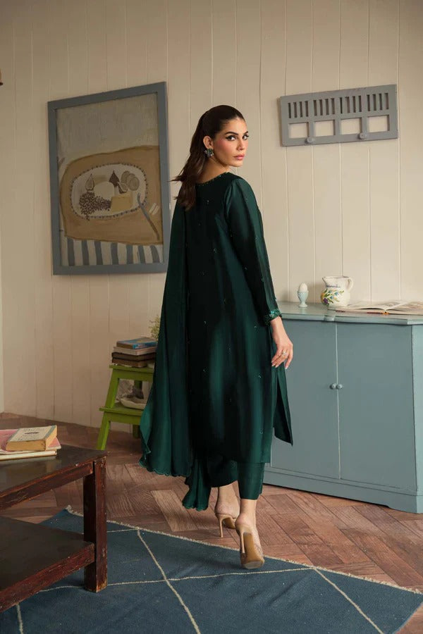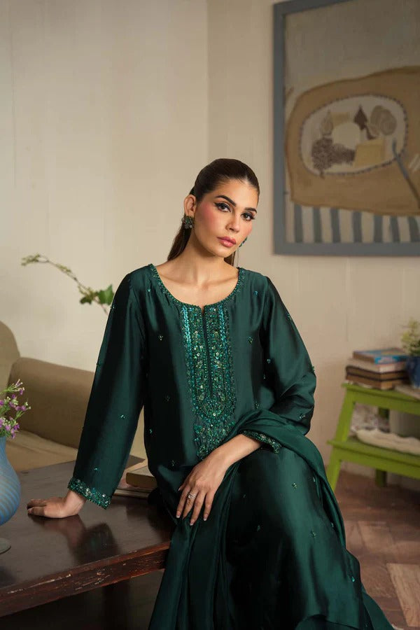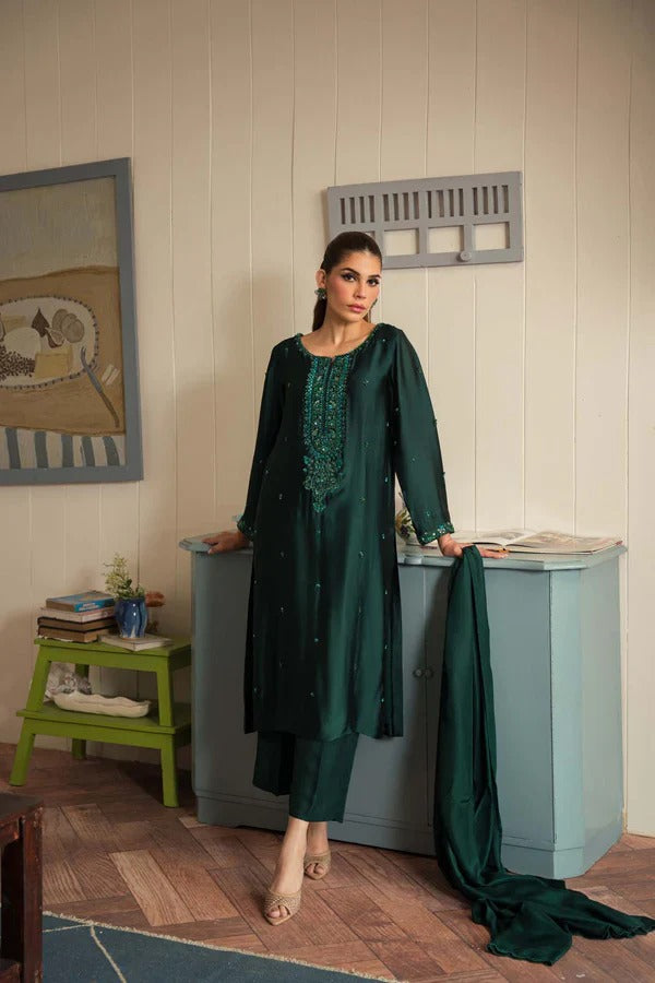 This exquisite 3-piece outfit is fully hand embellished, showcasing delicate craftsmanship with pearls, sequins, crystals, katdana, and dabka work beautifully placed on the shirt’s hem. Crafted from pure tussel silk and paired with a medium silk dupatta, this ensemble is a perfect blend of luxury and refinement—ideal for any formal event.