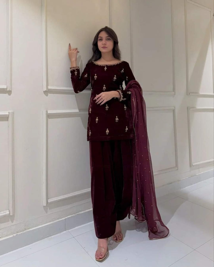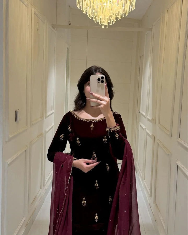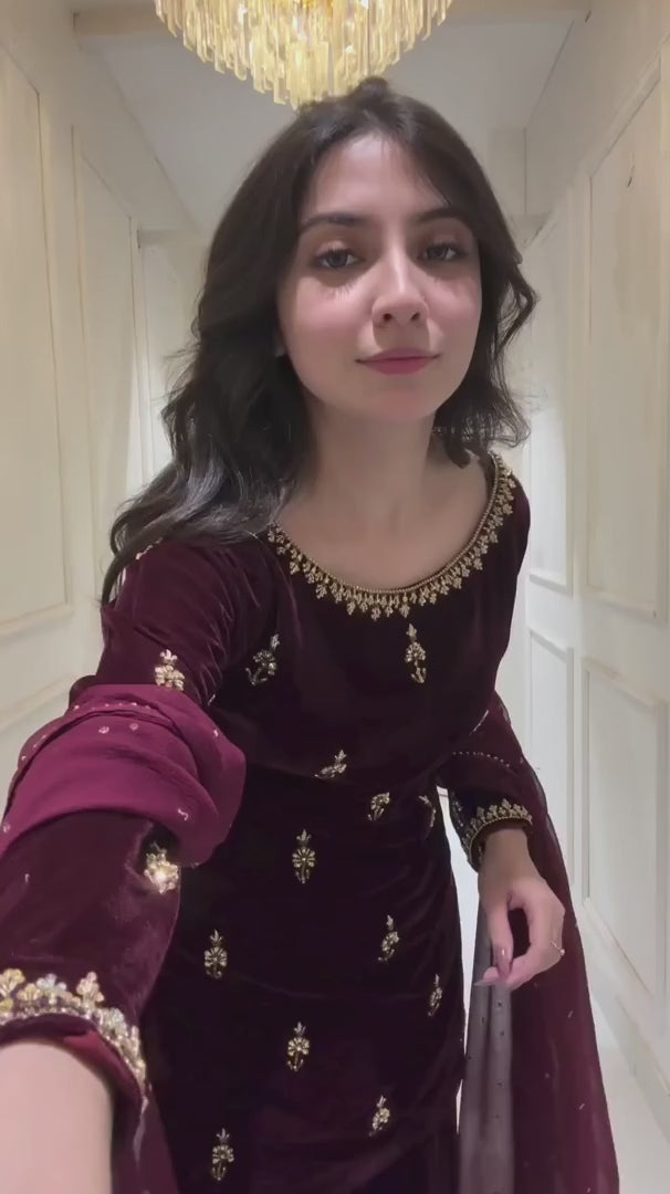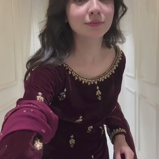 Indulge in luxury with this elegant 3-piece velvet dress. Featuring intricate floral embroidery, this outfit exudes sophistication and charm. The deep maroon velvet is paired with a delicate chiffon dupatta, adorned with Mukesh work, adding a graceful flow to the ensemble.This dress is designed for a flattering silhouette, perfect for formal gatherings and festive occasions.