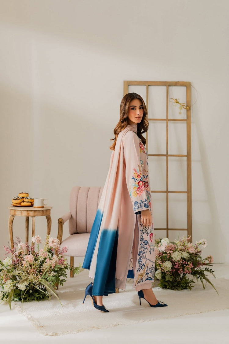 VINTAGE-3PC DHANAK EMBROIDERED SHIRT WITH TYE & DYE CHIFFON DUPATTA AND TROUSER-BIC-4314