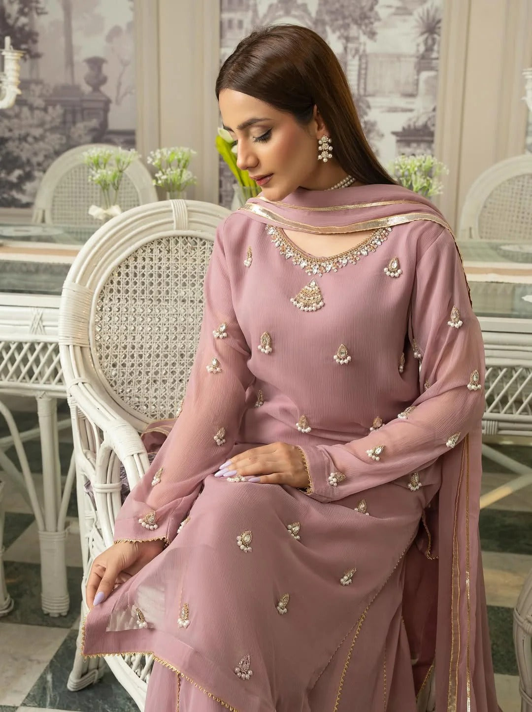 This 3-piece stitched ensemble features a meticulously crafted chiffon shirt and dupatta, paired with a beautifully flared sharara. Enhanced with delicate and detailed embroidery, the outfit perfectly blends timeless sophistication with contemporary charm. Ideal for festive celebrations, wedding events, or any occasion where you wish to stand out with effortless grace
